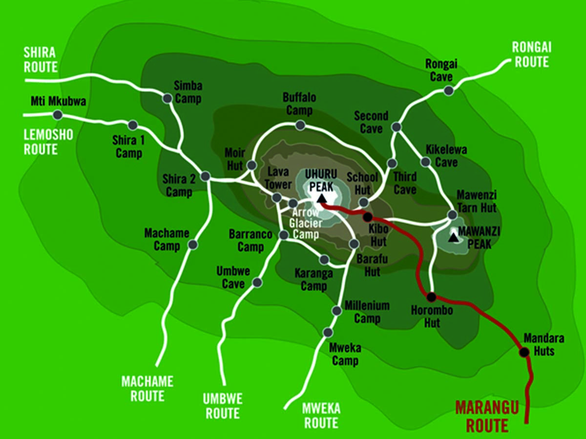 Machame (“Whiskey”) Route *** Known as the “Whiskey” route, the Machame route is now the most popular route on the mountain. Compared with Marangu, the days on Machame are longer and the walks are steeper. The Machame route is considered a difficult route, and is better suited for more adventurous folks and those with some hiking or backpacking experience. The route begins from the south, then heads east, traversing underneath Kilimanjaro’s southern ice field before summiting. The minimum number of days required for this route is six days, although seven days is recommended. The Machame route is scenically beautiful and varied. However, due to the heavy crowds, it loses some of its spendor.